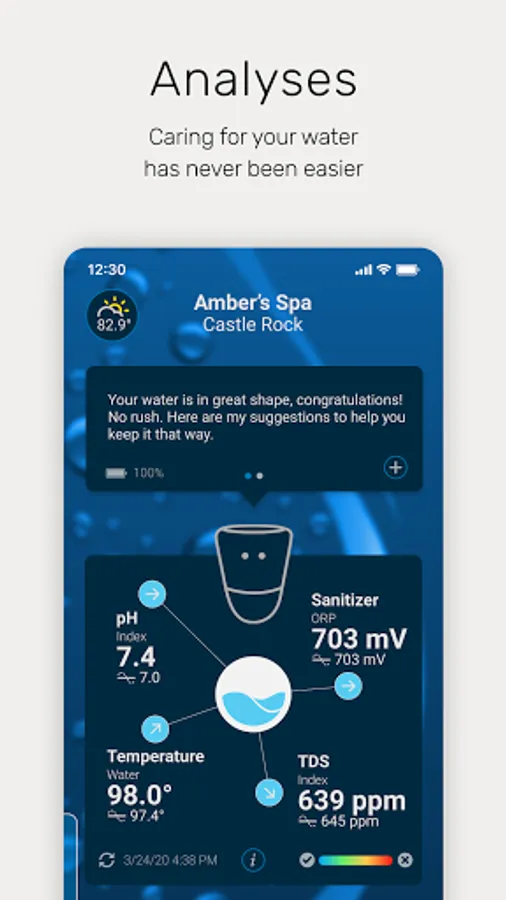 iCare analyzes your spa water quality every hour: temperature, pH, disinfection (ORP), TDS, salt and provides an exclusive water index.