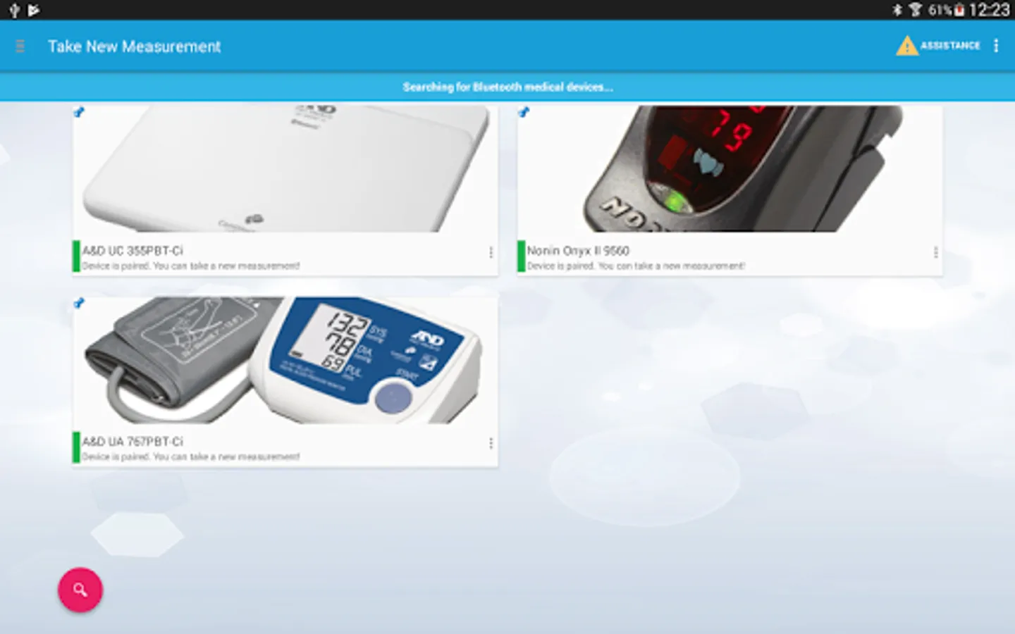 • Take a new measurement: Easily gat new physical measurements, using one of the supported Bluetooth health devices. Save the measurements to your cloud health account. Measure: