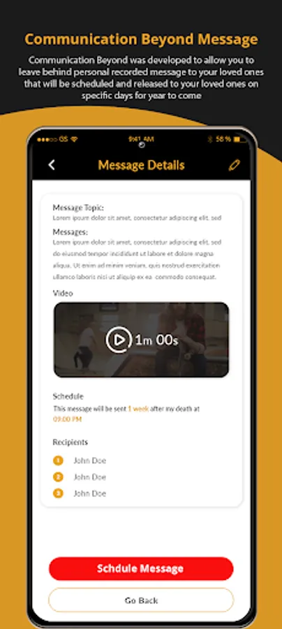 iWillMessage’s Communication Beyond was developed to allow you to leave behind personal recorded messages to your loved ones. These messages would be scheduled and released to your loved ones on specific days for years to come ensuring that the bond you’ve developed will not only be everlasting, but physically and digitally immortalized.