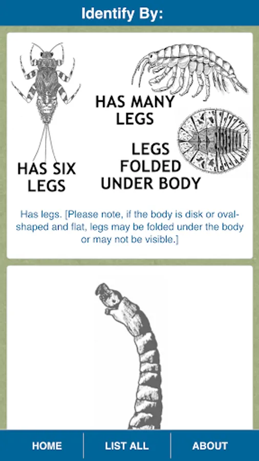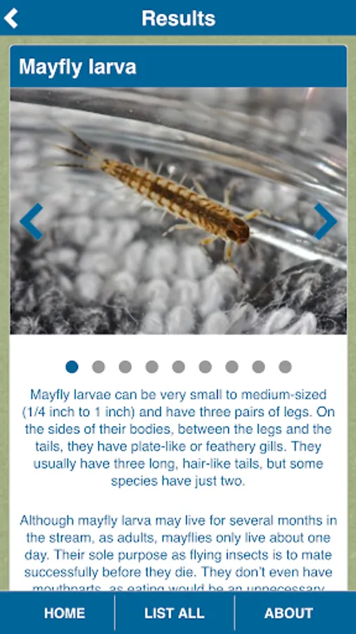 Got the wrong bug? Hit the Not My Bug button and the app immediately shows you the top five most likely alternatives. You can also choose List All at any time for an alphabetized list of all common macroinvertebrates (insects and crustaceans) found in freshwater streams.