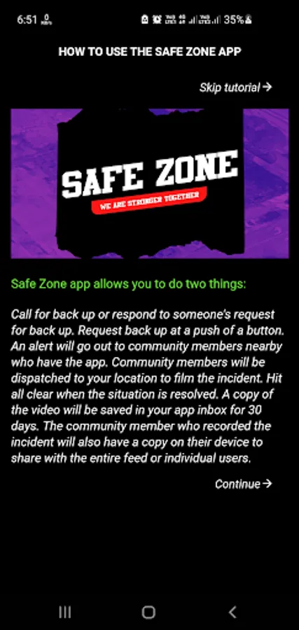 The Safe Zone app allows users to record and share videos to document their journey towards safer communities. Share those lessons with the public feed or select users to amplify lessons learned and promote best practices others can use in their local communities.