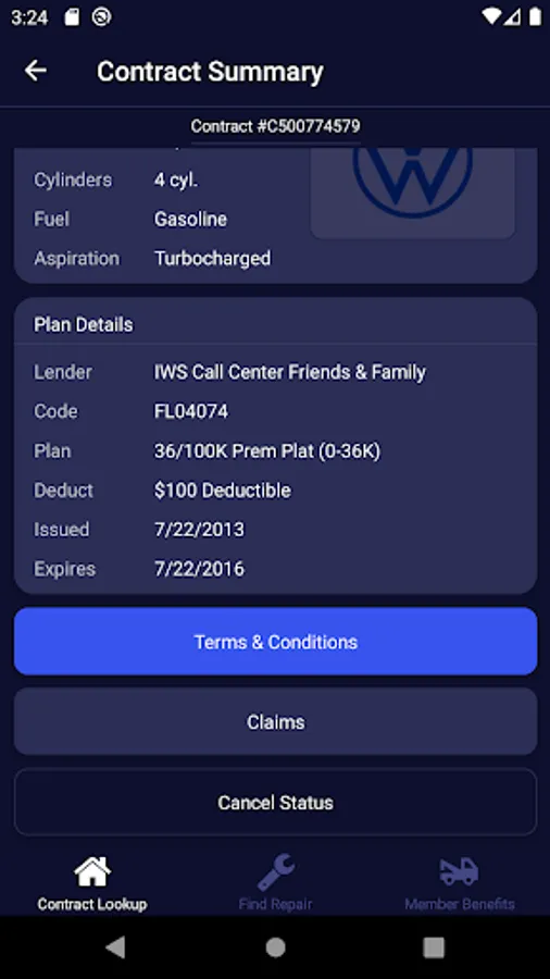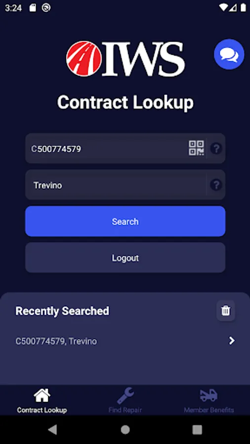 Get started using the contract Declaration page you received in the mail from IWS. Scan the QR code or enter your contract number and last name. You will then be logged in and presented with an overview of your contract information and claims. If allowed, the app will receive push notifications about claims status changes.