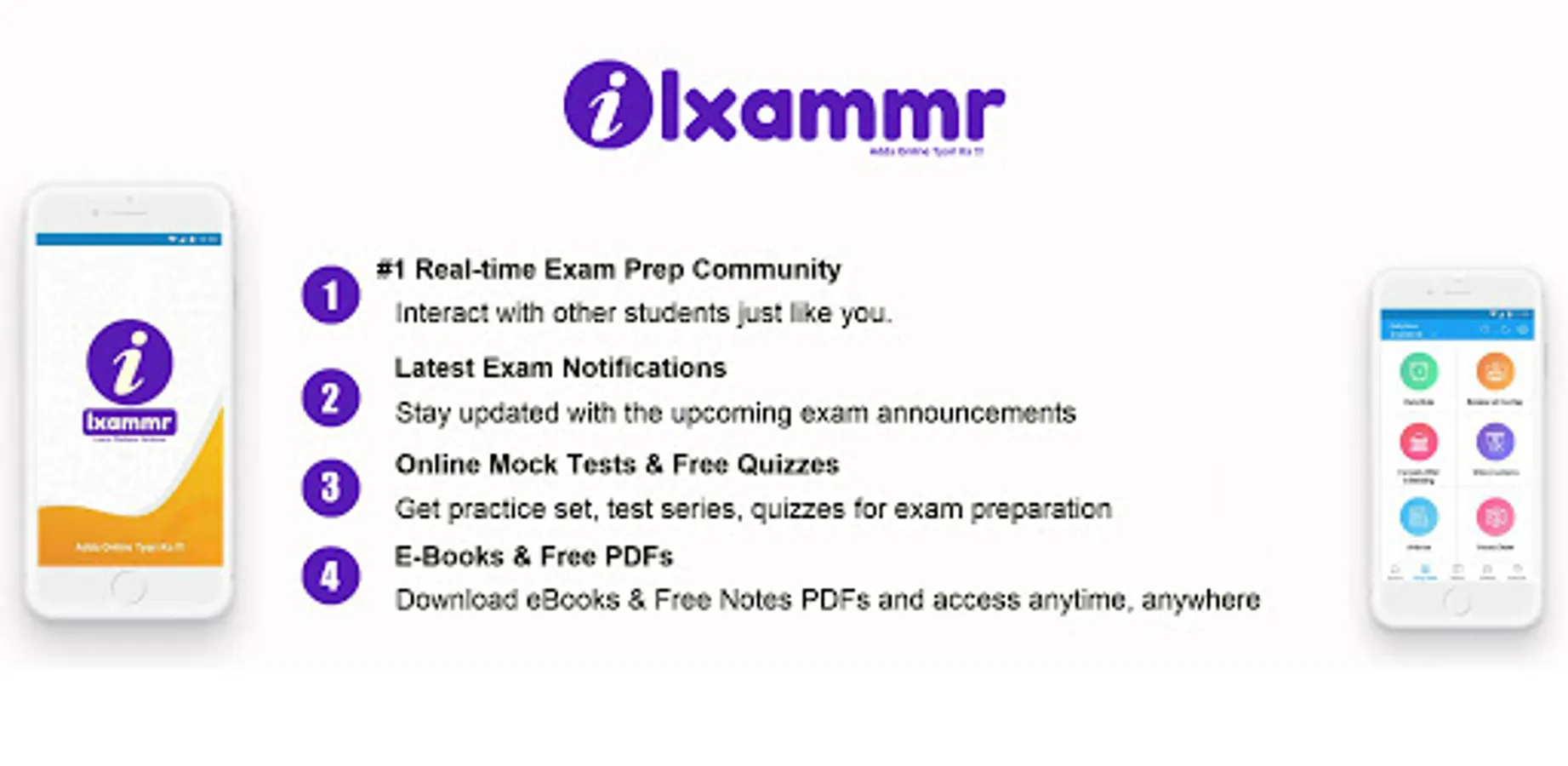 Download Ixammr app to prepare for 100+ Exams with Free mock test papers, daily current affairs & Daily GK. Also get previous year solved papers, unlimited practice questions, daily quizzes, doubt solutions exam notifications & much more. We aim at providing the best learning environment with an end-to-end preparation model. We’ve introduced live coaching, free mock tests, and personalized doubts sessions, E-Books, Sectional Mock Tests, and PDF Notes. We provide complete study material for the following exams-