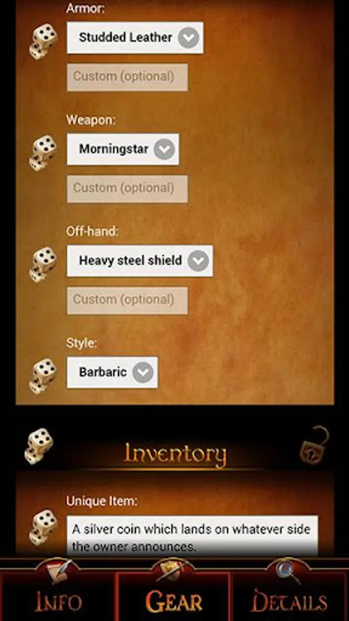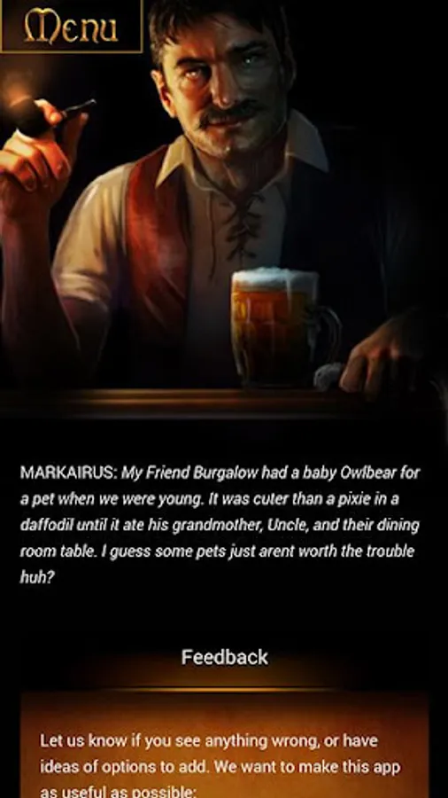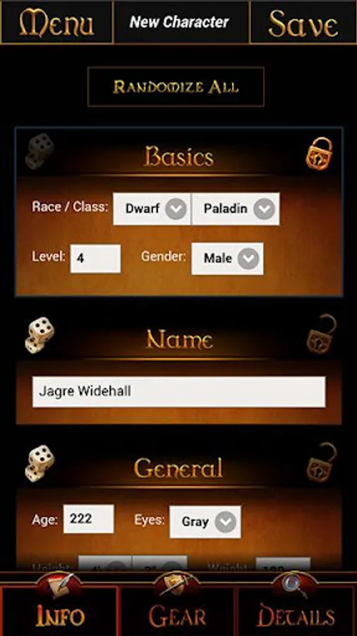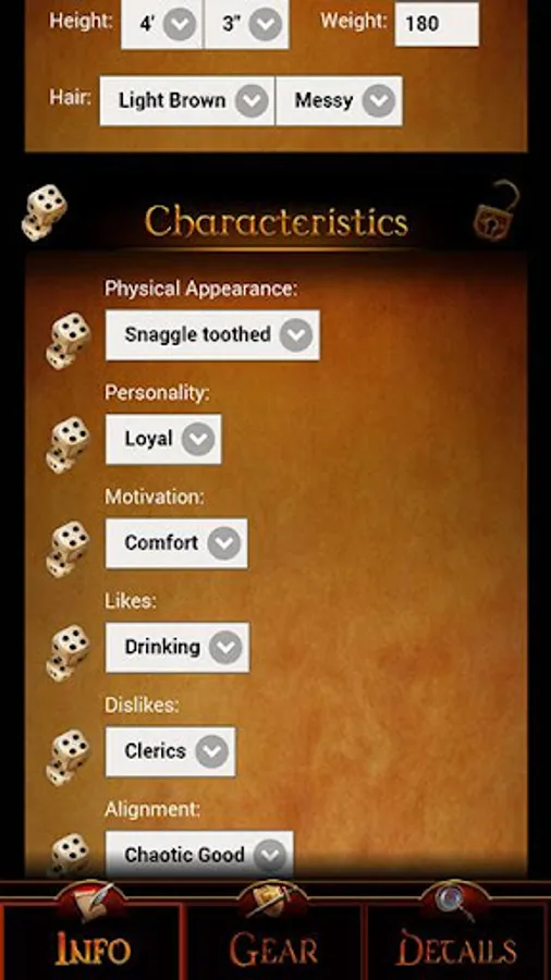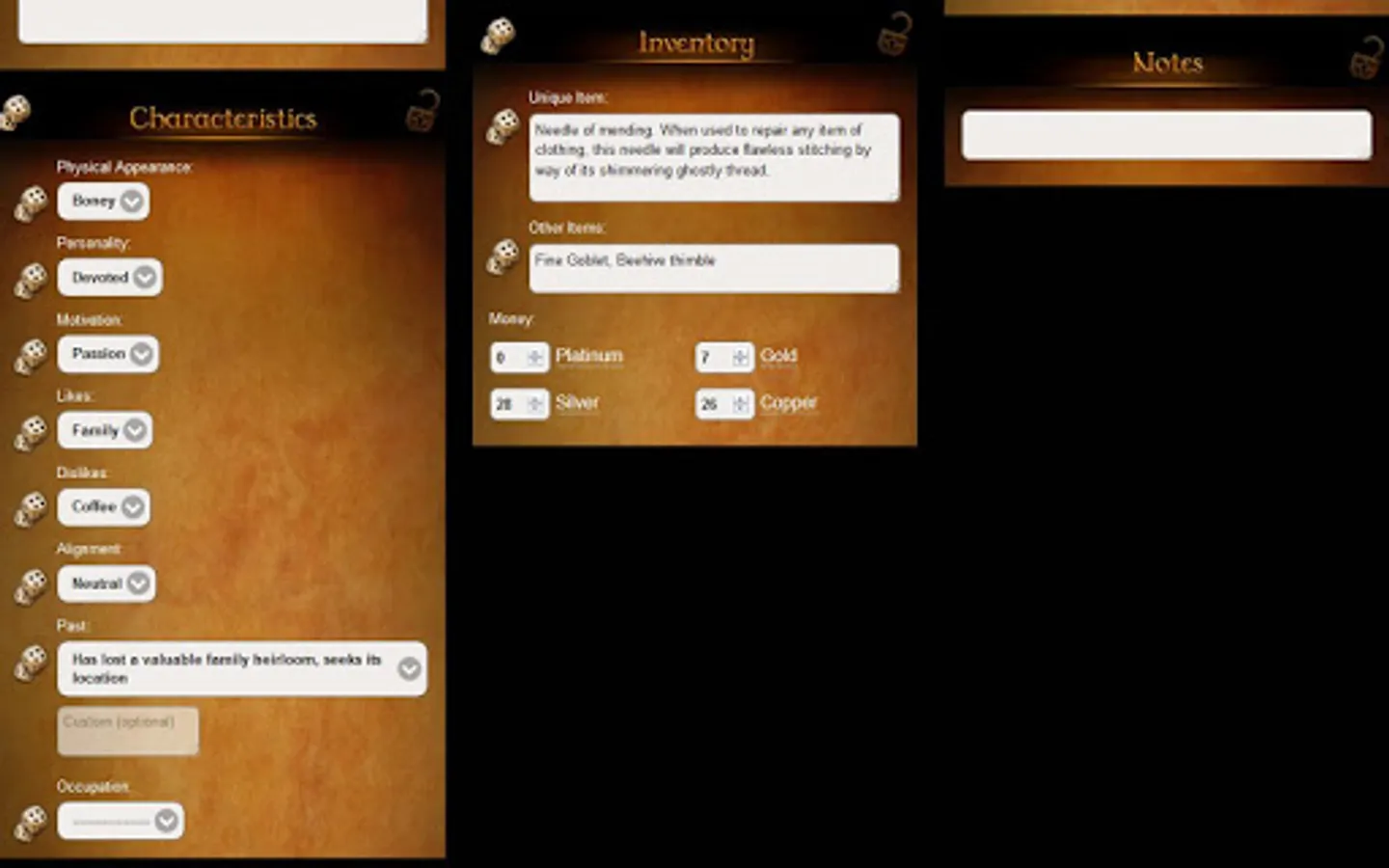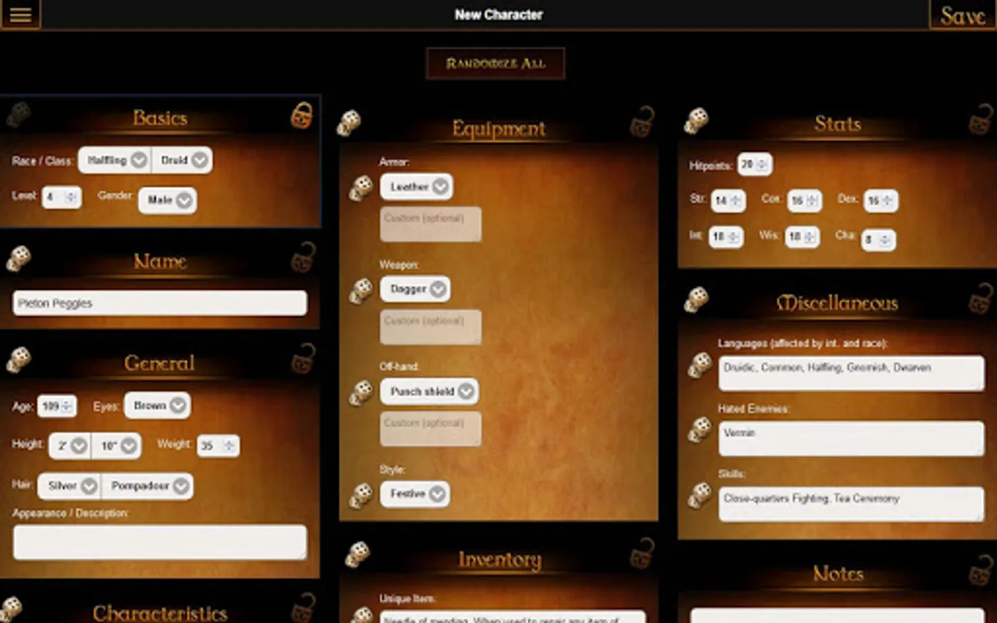 Character names are based on race and are unique and pronounceable. Our name lists, and items will grow with every update. The ability to save your characters, you will be able to populate your campaign with characters ranging from a simple barkeep, to that pesky rogue that just won't leave your party alone. Add and edit your notes to your saved characters, and these personas will grow along with your campaign. We provide you with the framework, the rest is up to you and your limitless imagination. Unique names, physical features, personality, back stories, weapons, armor, and items, are just the start of what awaits inside. Come join us, and bring your next session to another level.