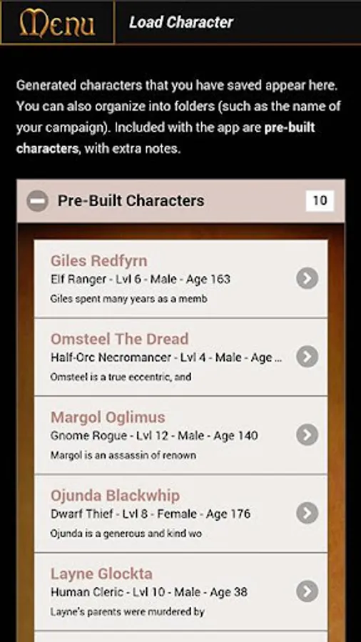 Group into folders for your campaign. No limit on the number of characters. App comes with 10 pre-built characters with unique bios and items.