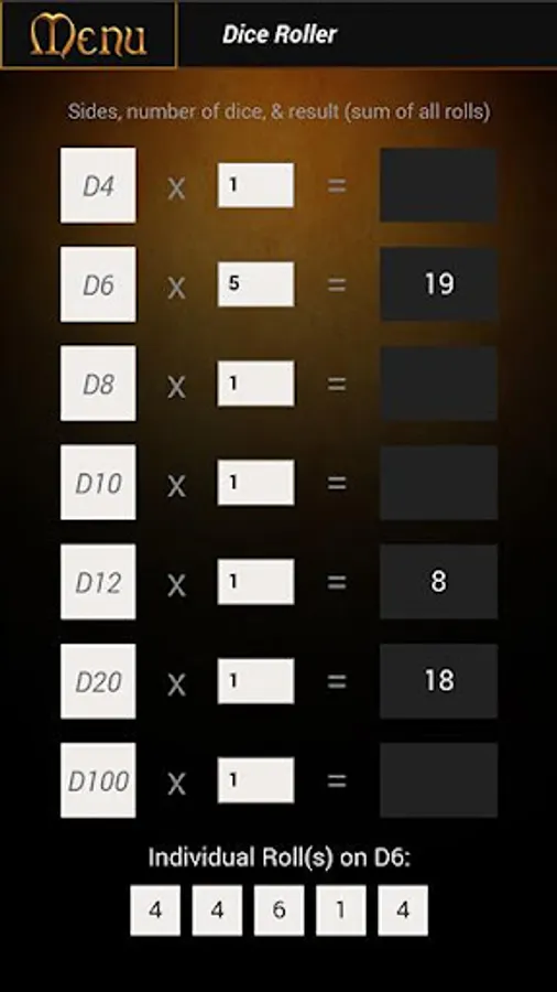 DICE: A simple dice roller for D4, D6, D8, D10, D12, D20, and D100. Choose the number of dice and see the result of each individual roll.