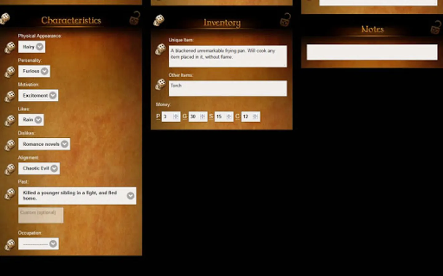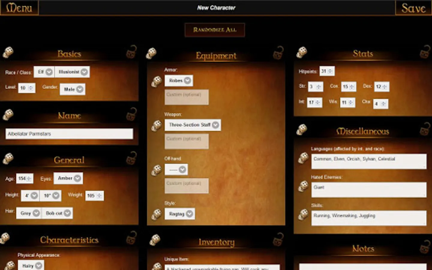Creates a random character with various physical and personality traits to help with roleplaying and backstory. Great for a quick NPC needed on the fly, or planning out ideas for a more in-depth player character. Weapons and armor are selected that make sense for your class and level. Also generates interesting inventory items and has a section for stats, languages, notes and more. AD&D: Dungeons and Dragons friendly (2nd Edition+).