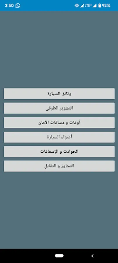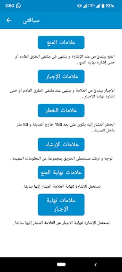 يتوفر أيضا تطبيقنا عن مجموعة من الدروس و التي تخص : أضواء السيارة ، الوقوف و التوقف ، دروس حق الاسبقية و المخالفات .