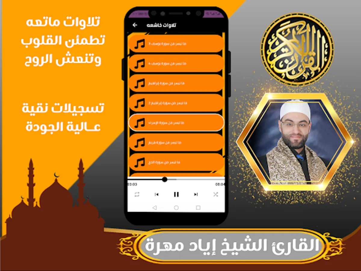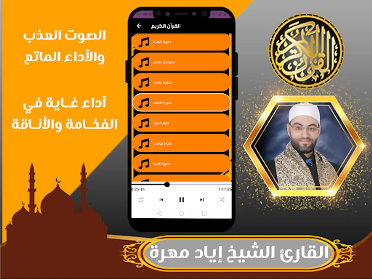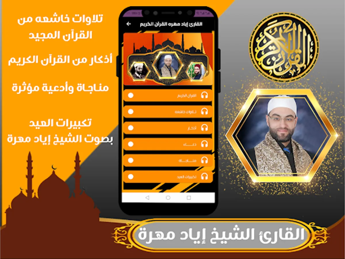 The application of the Qur’an Sheikh Iyad Mahra allows you to hear and download the Holy Qur’an with the voice of the reciter Iyad Mahra, and you can download the Holy Qur’an to your mobile phone easily and conveniently through one application that includes recitations and surahs from the Holy Qur’an mp3 with the voice of the reciter Iyad Mahra