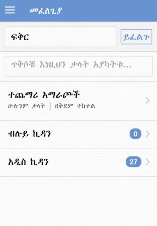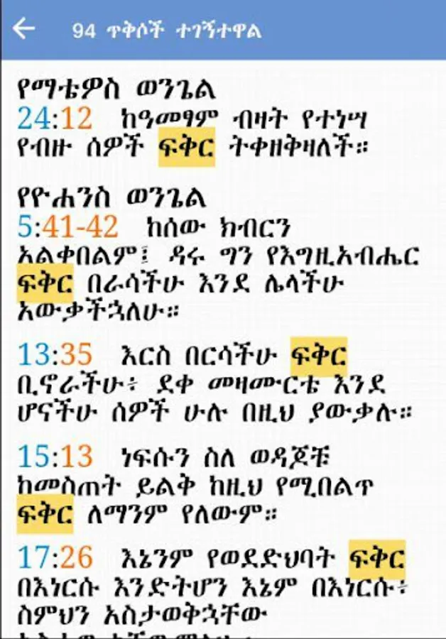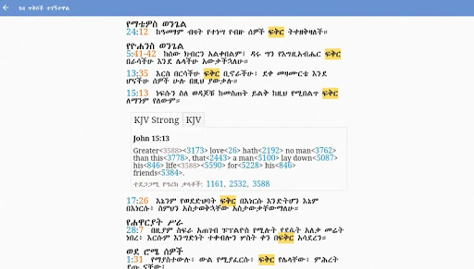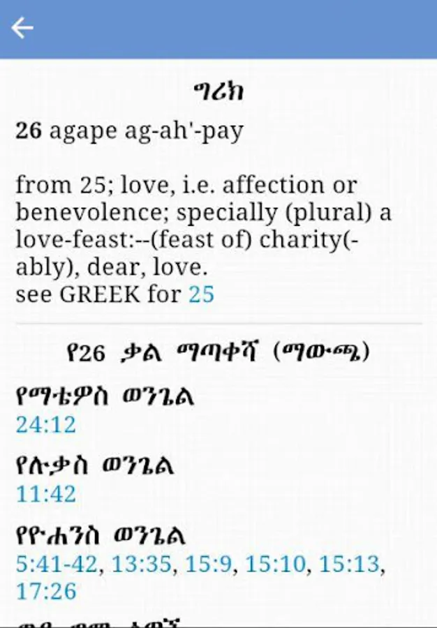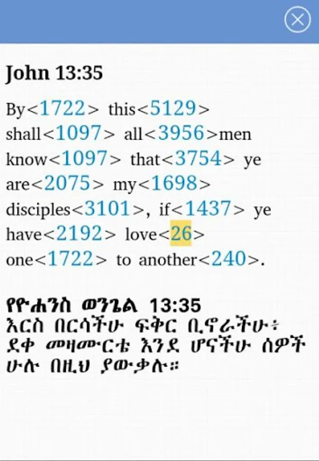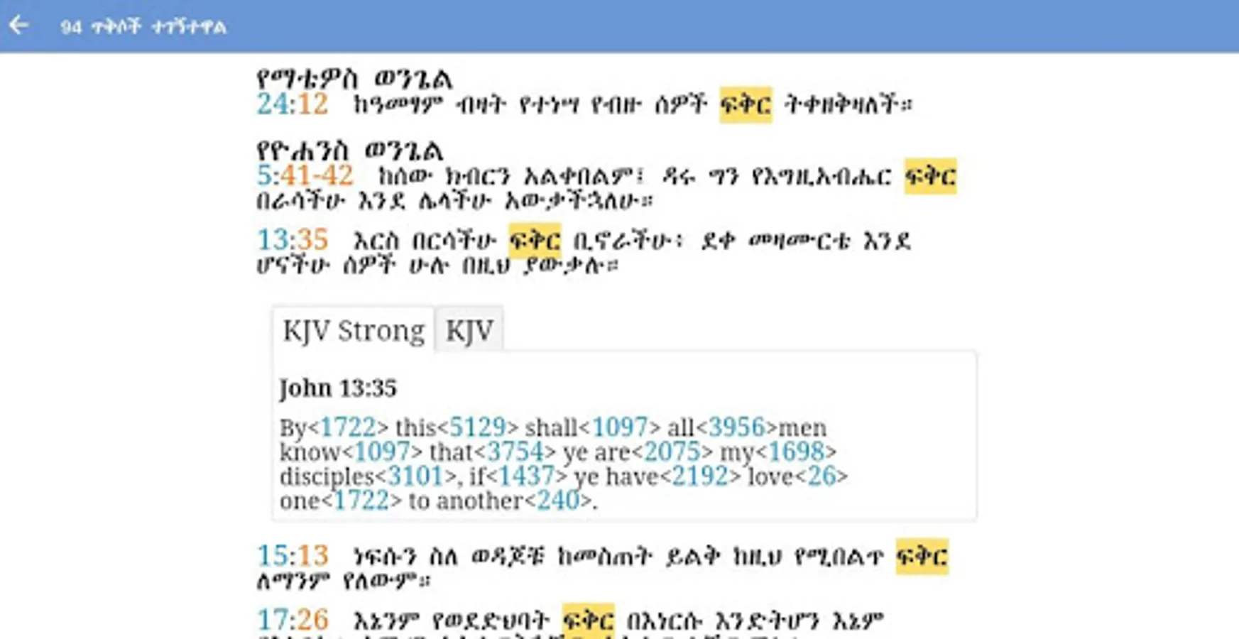 Iota Amharic is an Amharic Bible App with a powerful full featured search functionality and a Strong's numbering feature for Hebrew and Greek word references. Iota Amharic helps you to easily read and search the Amharic Bible and also dig deeper into the underlining Hebrew and Greek words.