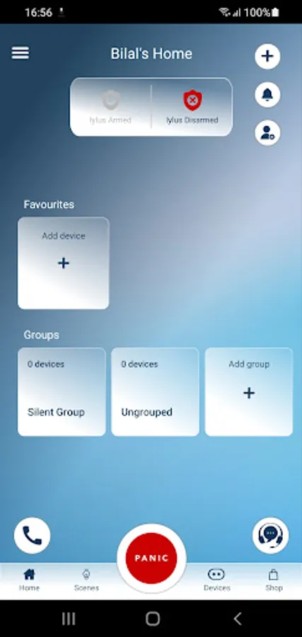 When Armed, any detected movement will trigger an Alarm. The user can also trigger the Alarm manually using an In-App Panic Button.