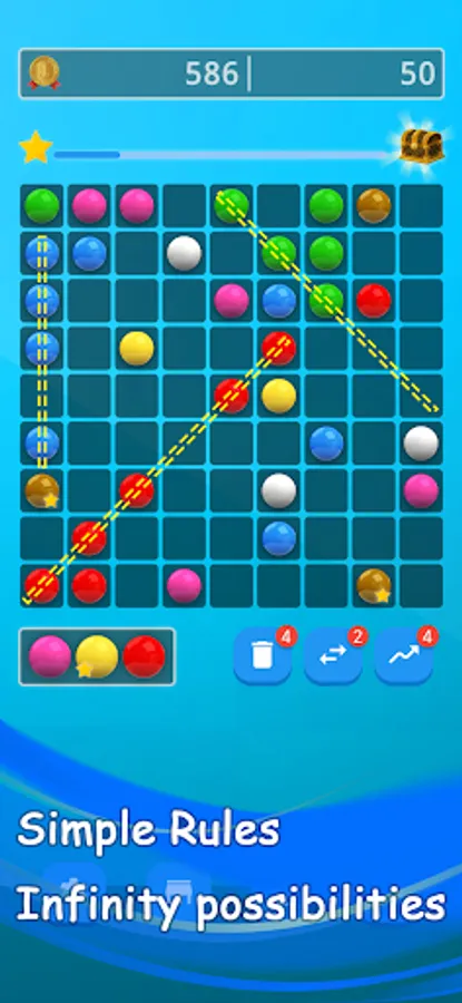 Your mission is to rearrange the color tiles to form a line of same color with at least 5 color balls in a line (row, column, cross). Then you have a color line, all the tiles will disappeared and the grid will be clean. Do it again as much as possible to get score.