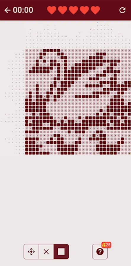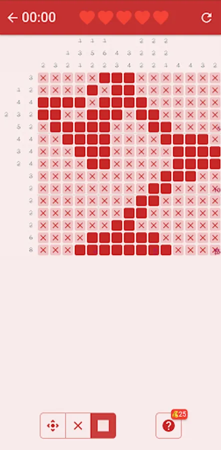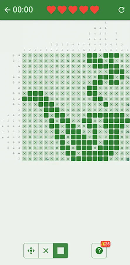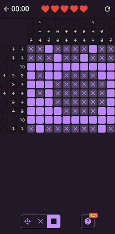 To solve a puzzle, one needs to determine which cells will be boxes and which will be empty. Solvers often use a dot or a cross to mark cells they are certain are spaces. Cells that can be determined by logic should be filled. If guessing is used, a single error can spread over the entire field and completely ruin the solution. An error sometimes comes to the surface only after a while, when it is very difficult to correct the puzzle. The hidden picture plays little or no part in the solving process, as it may mislead. The picture may help find and eliminate an error.