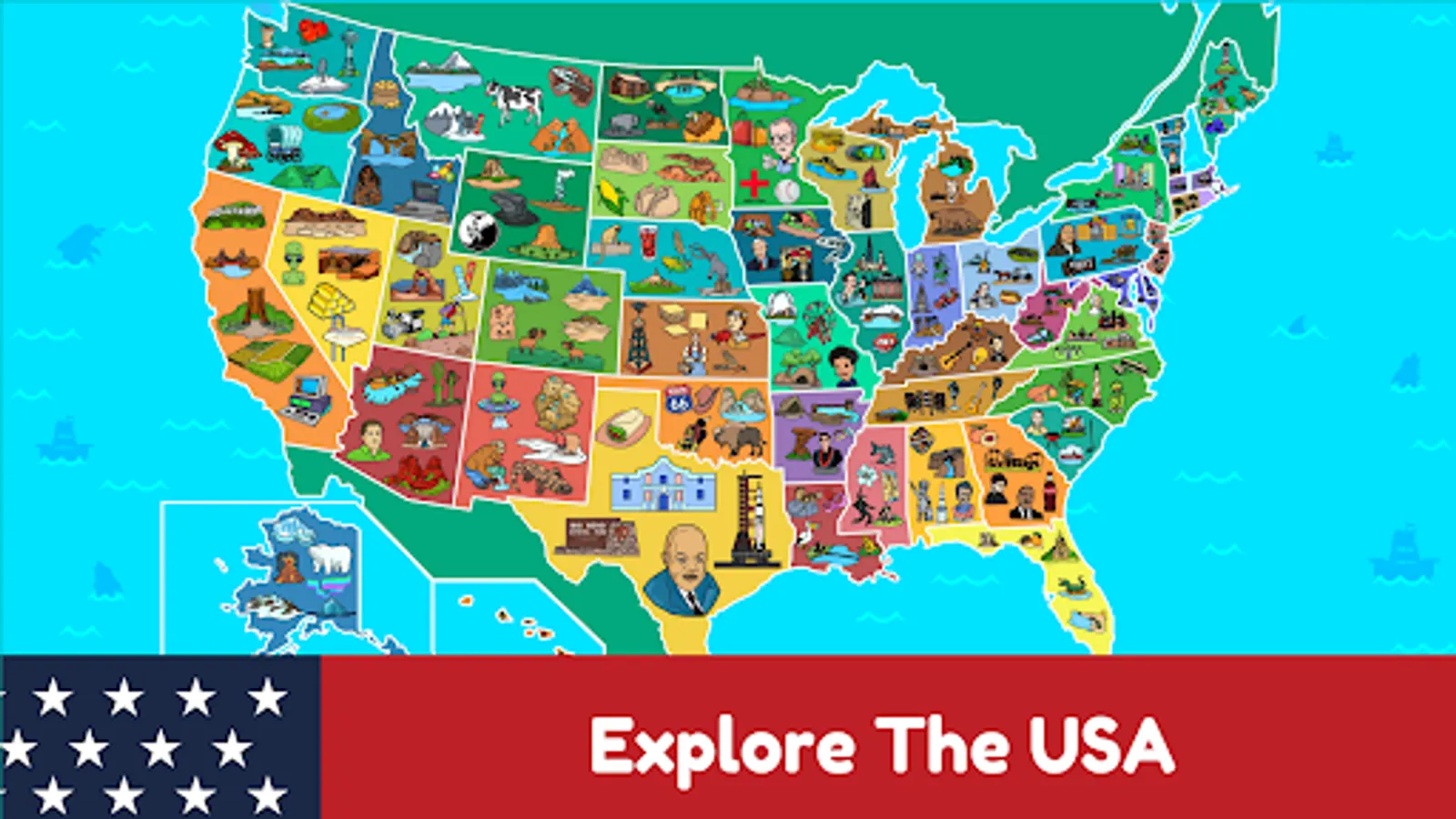 Presenting a brand new fun trivia educational geography game called "USA Map Kids Geography Games". In this game, you will learn everything about the United States of America. Explore the US Map, Cities, States, Capitals. Learn fun trivia, solve maps puzzles, quizzes, mini-games & many more all based on your favorite the United States of America.