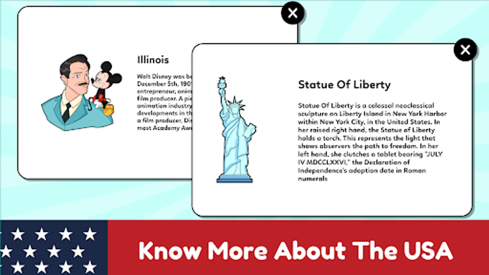 In the Explore section of the USA Map Kids Geography Games, you just need to tap on any famous US monument, public figures, states, cities, flag, and an information card about those same will pop up giving you brief information & trivia on that particular person, city, state, flag or monument.