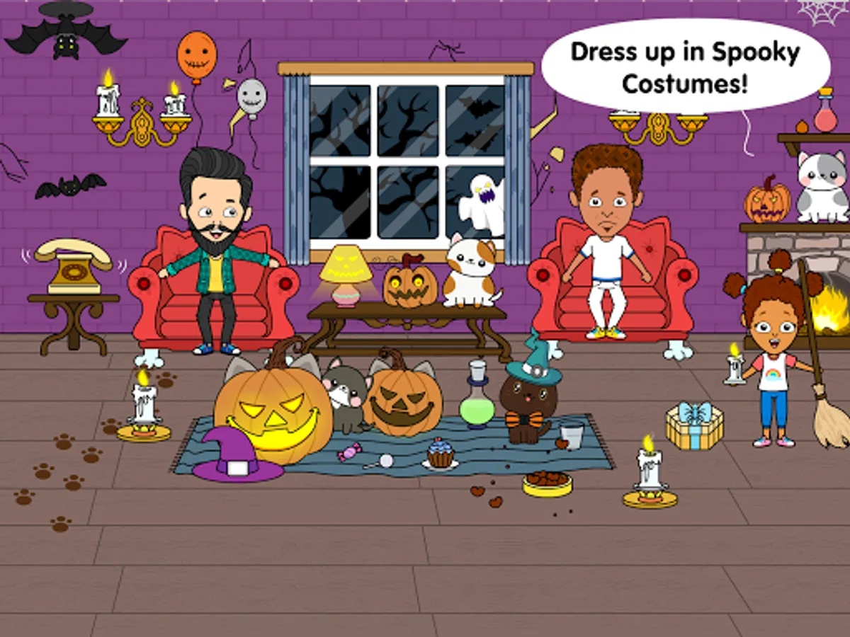 Have fun in the Halloween themed room with your cats. Dress them up in witch costumes and more!