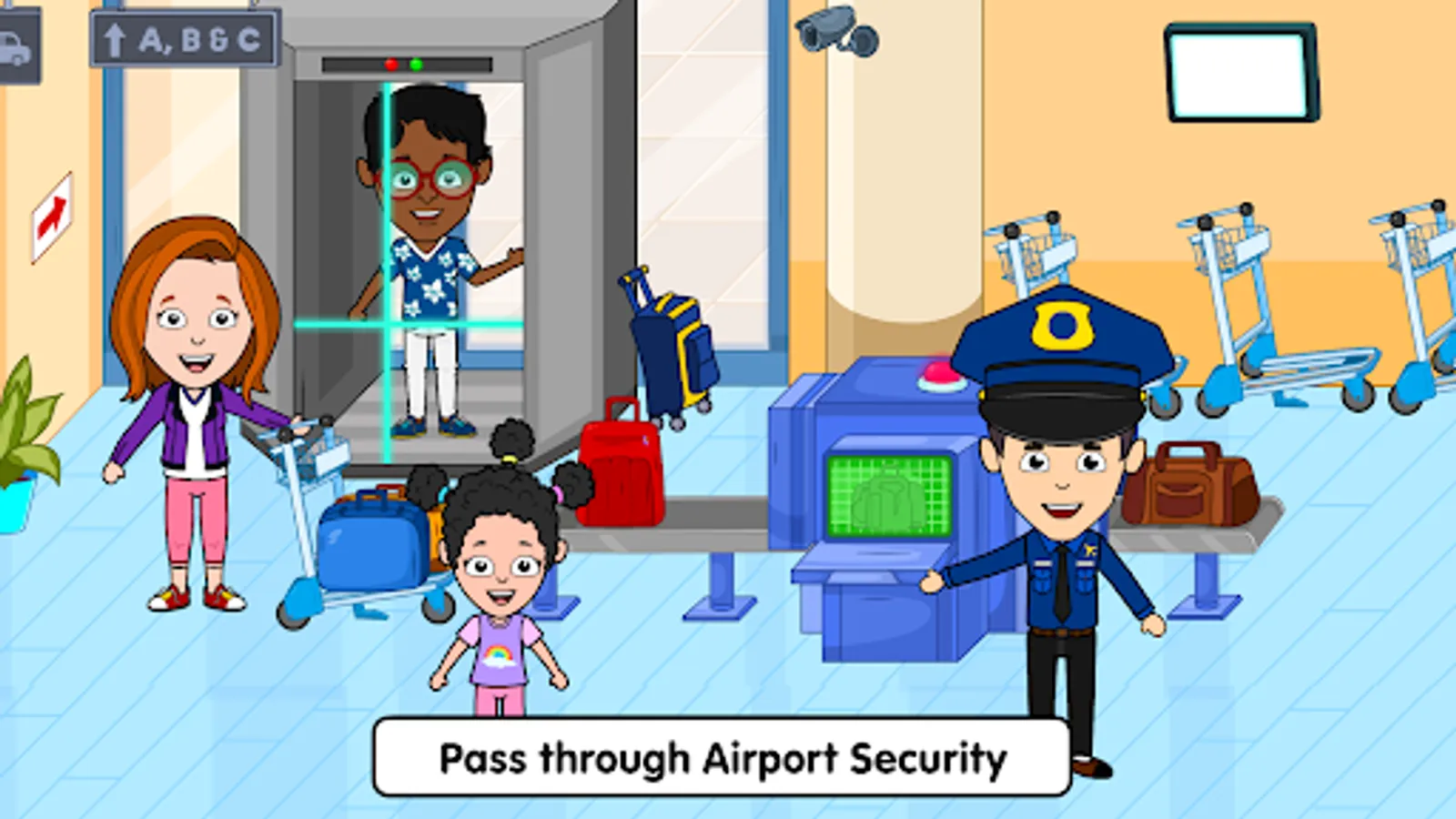 Scan every traveler to ensure the airport's safety. Help them finish the check-in process, by loading their bags and issuing boarding passes. It is exactly like a real airport travel works!