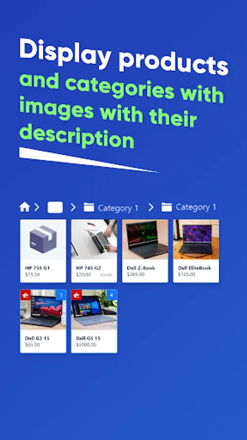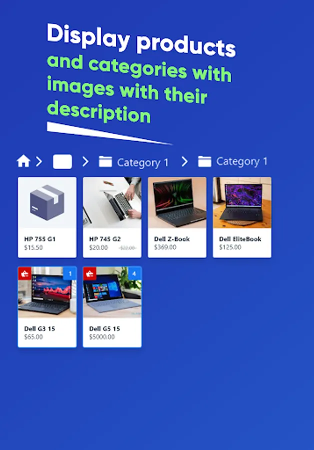 - Display products and categories with images with their description and search by the product’s name, ID, and Barcode.