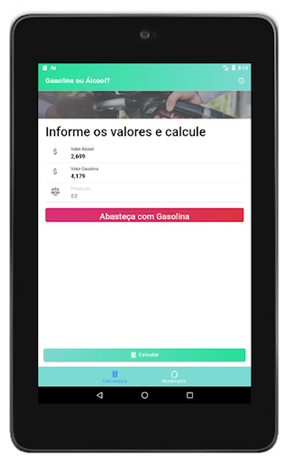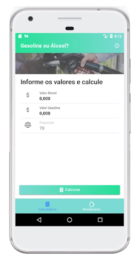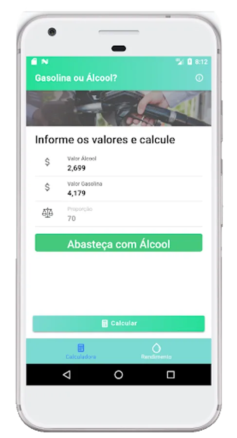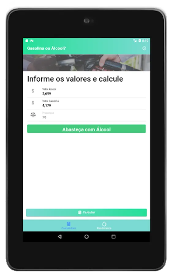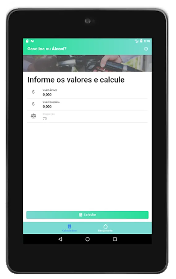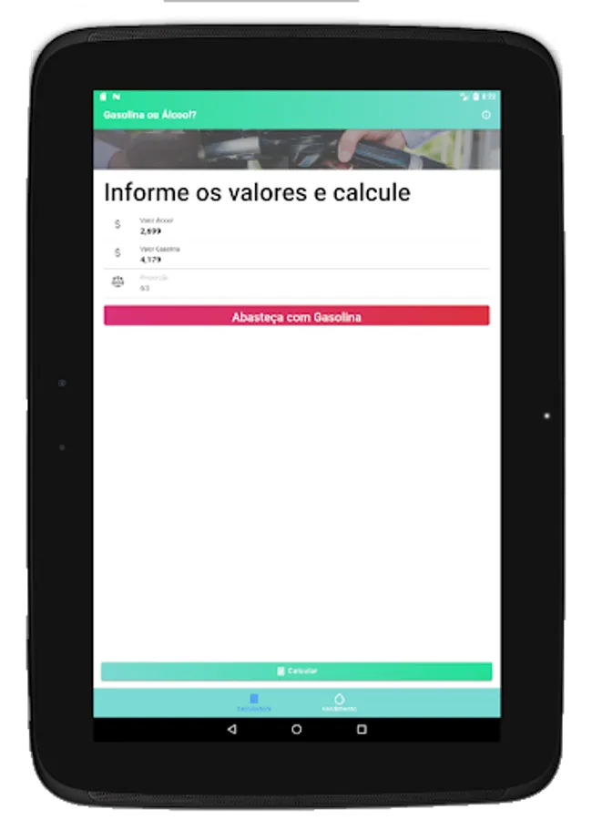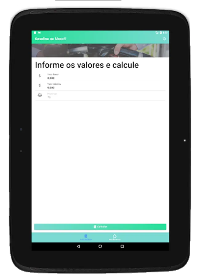To find out which fuel pays off more when refueling your vehicle, the app helps you in the calculation using by default the proportion of 70% between the values of gasoline and ethanol, so we save money.