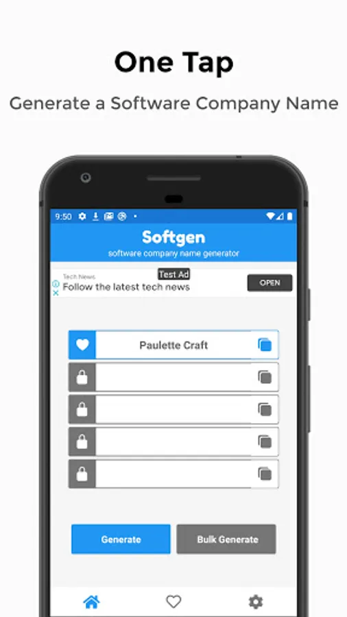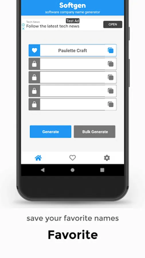 Softgen is a software company name generator app, this app can help you generate a software company name easily by using generate button, you can also save generated name by using heart button (save to favorite).
