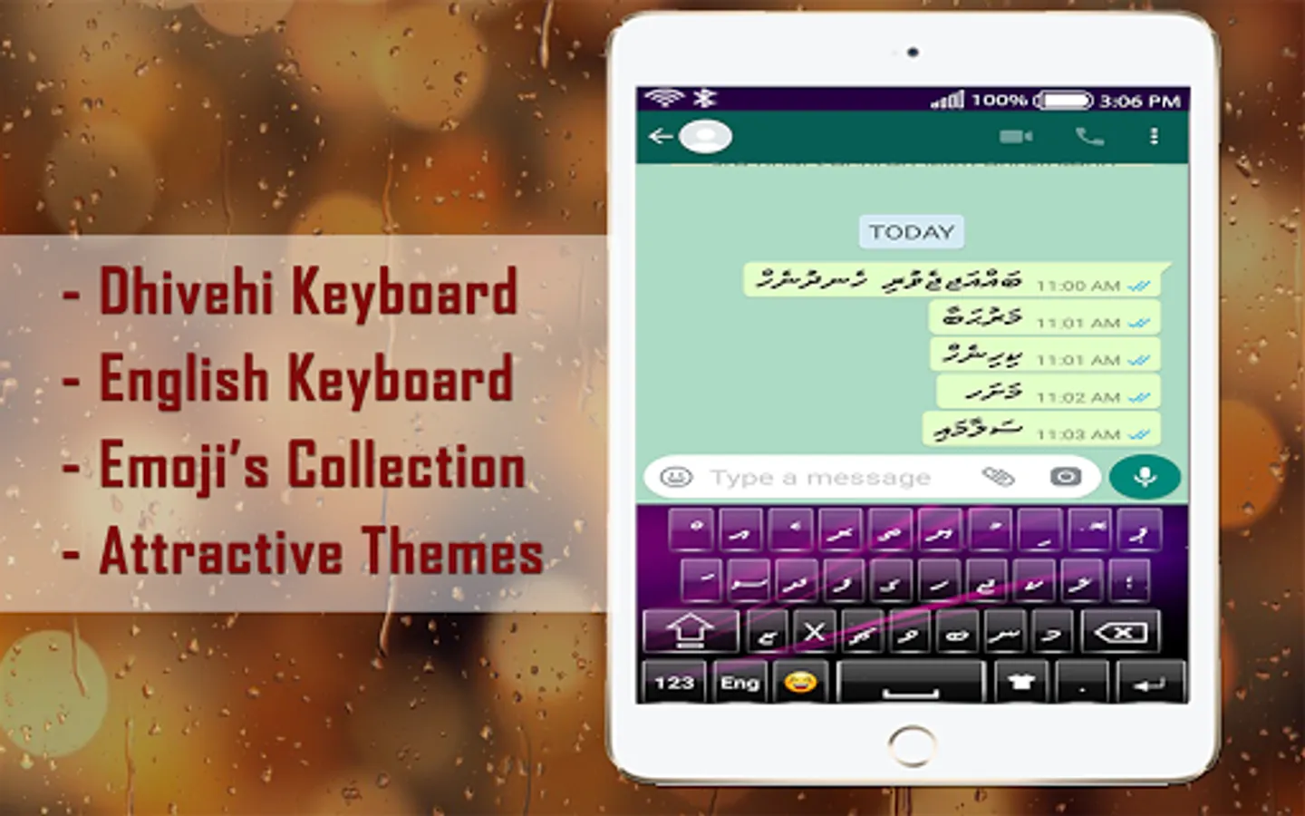 The Dhivehi keyboard is the best and fastest dual Android keyboard for writing Dhivehi, English with full Dhivehi characters support on just one Dhivehi keyboard layout. Dhivehi Keyboard app is designed with most complete features, standard Dhivehi Unicode character set, mathematical operators, symbols and Dhivehi fonts, theme customization keyboard. Easy fast English to Dhivehi language is switching with high performance and support for two Languages such as English and Dhivehi for Dhivehi speaking peoples on just one android Themes keyboard. Dhivehi typing keyboard is free to download with beautiful themes and 1000+ emojis in Dhivehi languages.