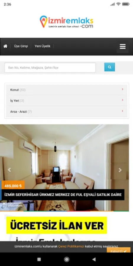 You can look at the advertisements of flats, workplaces, plots, detached houses, land for sale and rent in the Izmir region. You can look at 1+1, 2+1, 3+1 apartments for sale. You can also post a Free Real Estate Ad for Izmir.