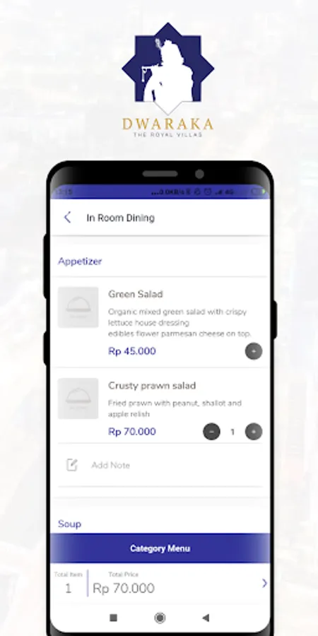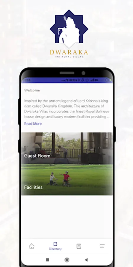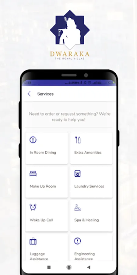 Dwaraka The Royal Villas Mobile Concierge App allows you, as guests, to be connected more seamlessly with hotel's services. By using the app, you can access hotel informations, interact with hotel's staffs for a range of in-house services throughout your stay and see notable places, landmarks or events around the hotel. You will also receive real-time notifications regarding hotel's latest promotions, updates, order status and many more.