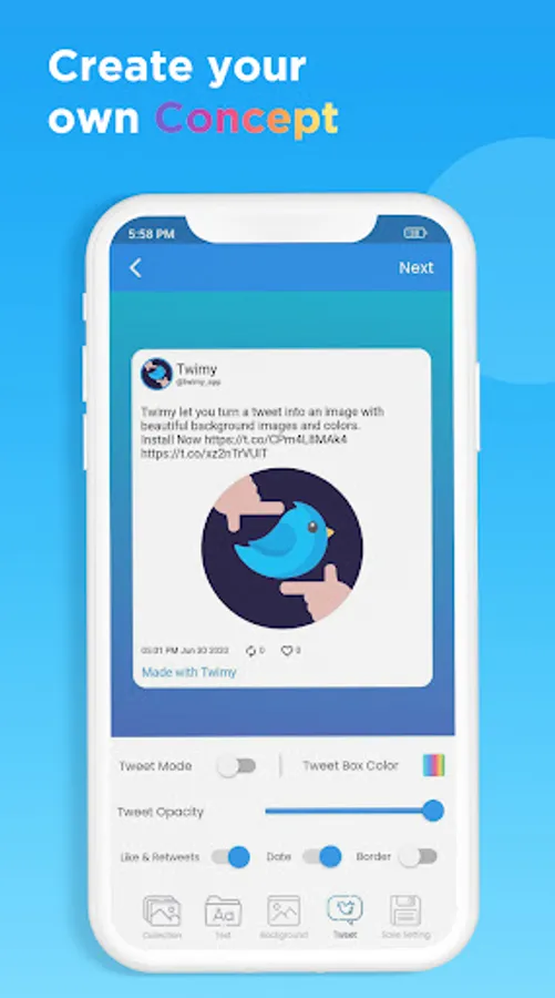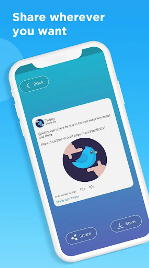 Twimy let you turn a tweet into a beautiful image for whatsapp status, instagram post/reels/stories, facebook stories and wallpaper with custom background images and colours. Save and share tweets with high-quality images.