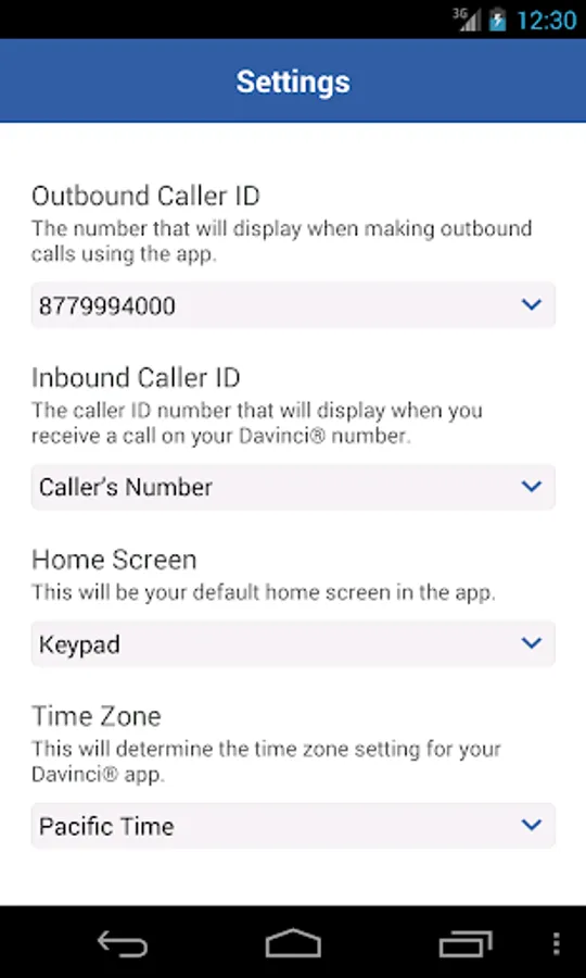 Note: No emergency calling (911) available using the Davinci Virtual Mobile Application.