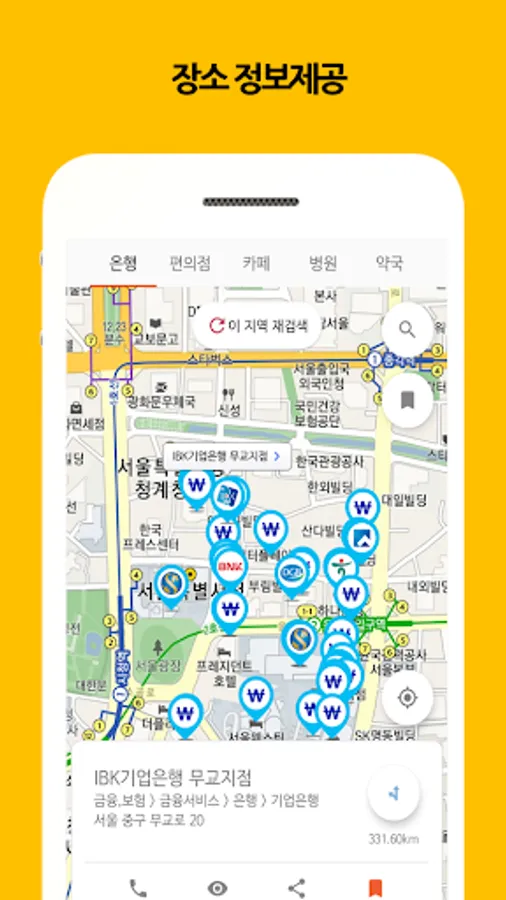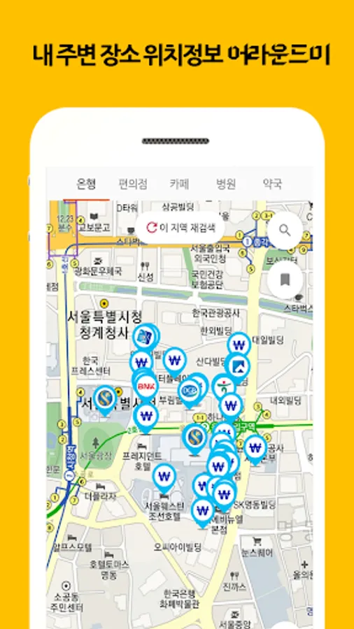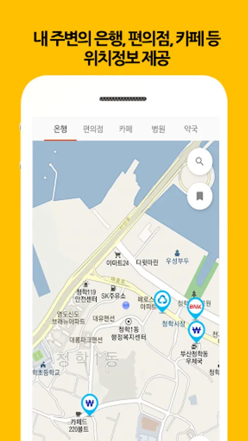 Provides location information for banks, convenience stores, cafes, hospitals, and pharmacies around me.