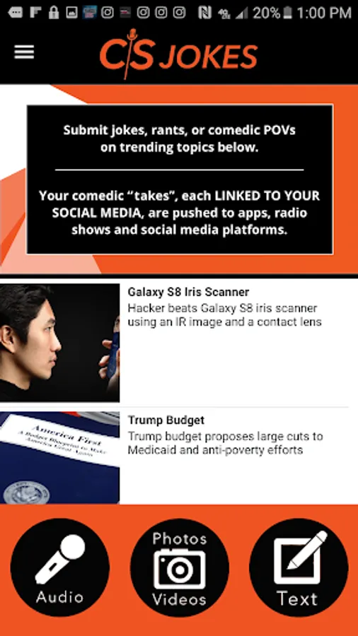 Comedians leave your “takes" on news in real time ..text/audio/video. Each joke, commentary or rant will be linked to your social media and pushed to Comicsay (and other APPS) , radio shows nationwide and social media platforms.