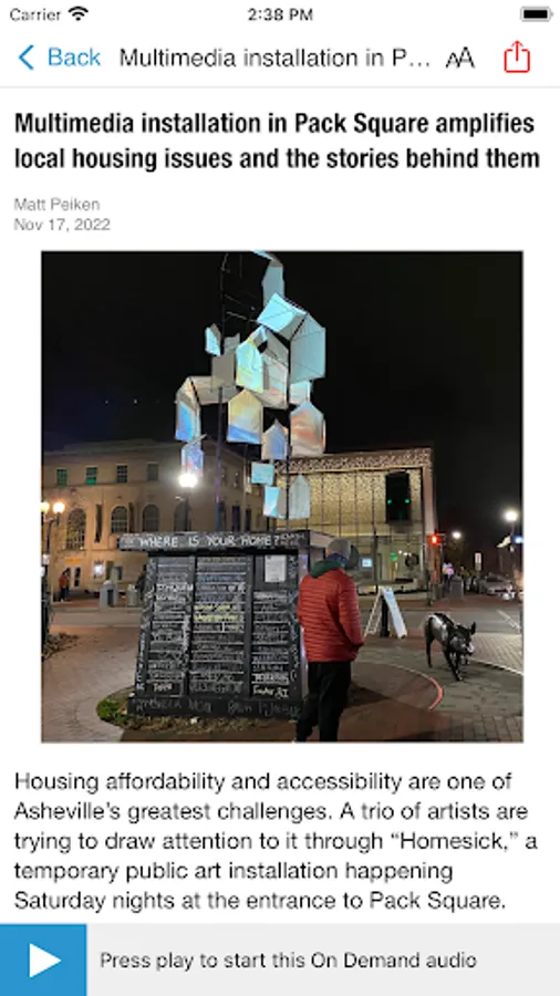 • Easy to access past programs. The Blue Ridge Public Radio App displays the web page associated with the program or program segment you are listening to On Demand so you can explore for more information.