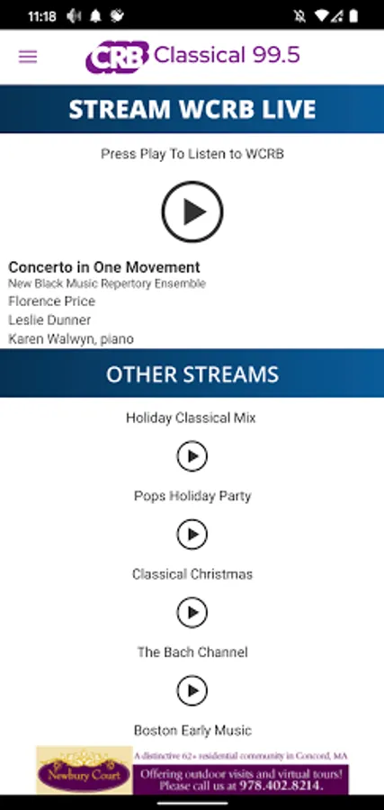Classical Radio Boston 99.5 WCRB is a streaming app programmed and hosted for today’s listeners. Hear live and on demand Boston Symphony Orchestra concerts from Symphony Hall and Tanglewood, as well as the Handel and Haydn Society, the Celebrity Series of Boston, and many others. Listen to additional curated streams like the Boston Early Music Channel, the Bach Channel, and holiday music. WCRB is part of national public media leader WGBH Boston