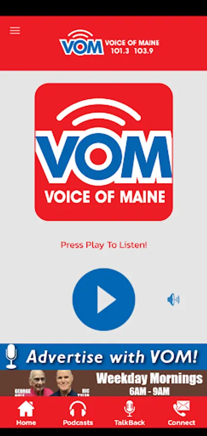 Never be without VOM, The Voice Of Maine! Stay connected and engaged with the official VOM mobile app. VOM is on your radio in Maine at 101.3 FM Augusta, 103.9 FM Bangor. Now you can listen to the Voice Of Maine from anywhere in the country with the VOM App. VOM's daily live talk radio lineup is at your finger tips. Listen to the VOM live stream or one of the locally produced VOM Podcasts. Listen to VOM at work, home, or in the car! Install the VOM app and get instant access today.