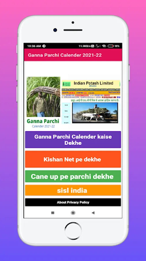 This Ganna Parchi app can help for those Farmers who belongs from Uttar Pradesh to check their Ganna Parchi .In this app information about organic farming and organic pesticide is given along with sugarcane slip calendar.