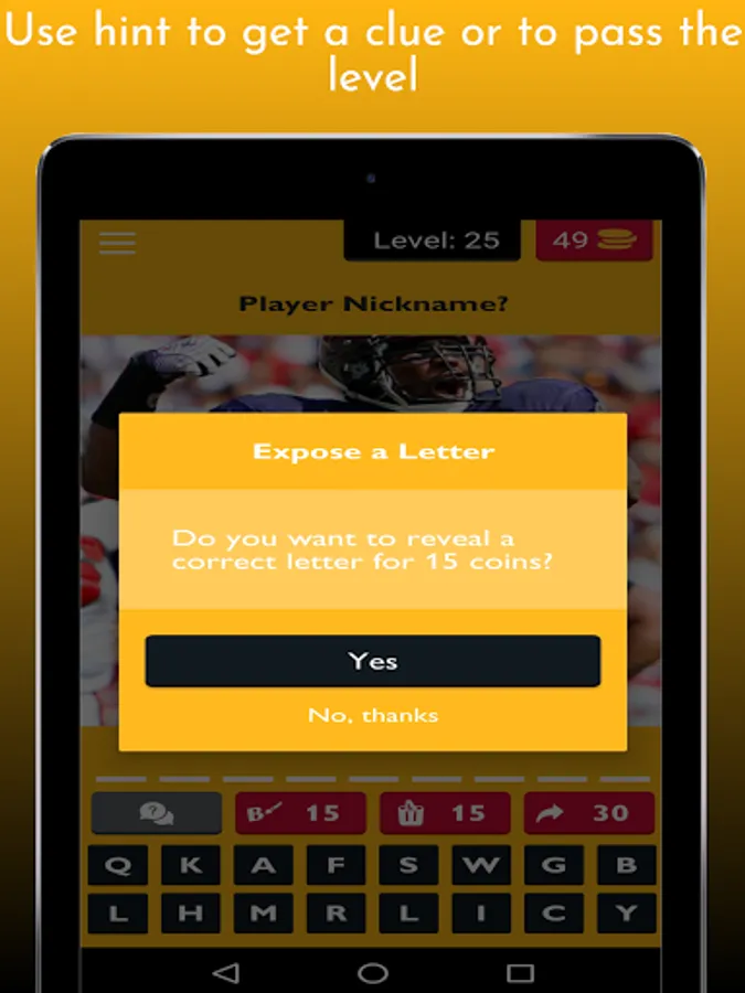 4) Use Hints to help you by exposing letters in the word, removing letters not in the word or solving the question (Remember Hints deduct coins)