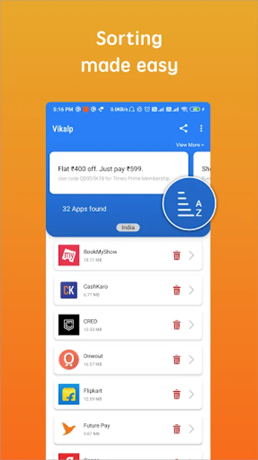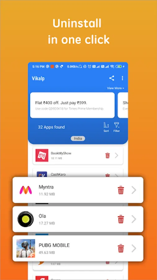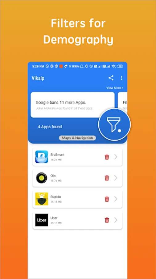 Vikalp is a tool to uninstall apps on your Android Phones. It helps free up more space by removing unnecessary apps. Click on the delete icon next to the app name to uninstall it. Easy and Simple!