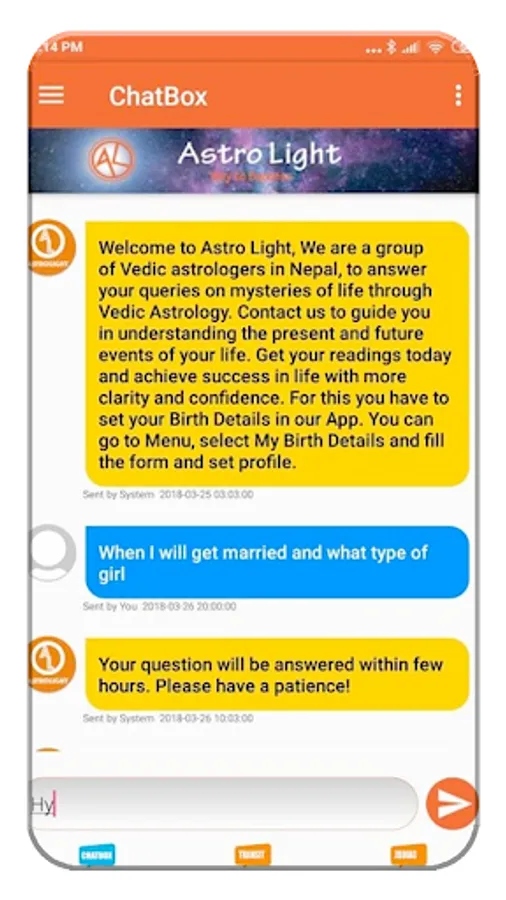 Jyotish : My Astrologer app (English and Hindi Language) is designed to make the knowledge of Vedic astrology available to all the people across the globe, handily on to their mobile devices. Jyotish : My Astrologer is like astrologer in your palm. The user can ask astrologers for the queries.
