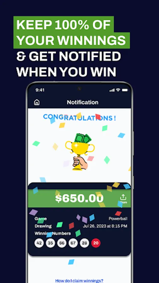 * GET NOTIFIED WHEN YOU WIN – Every year, millions of dollars in lottery winnings go unclaimed due to lost tickets or people not realizing they’ve won. We’ll keep your ticket stored safely, and as soon as the numbers are drawn, we’ll send you a notification if you’ve won. If you win a small prize (under $600) we’ll transfer the money directly to your account instantly. If you win BIG, we will hand deliver the winning ticket to you so you can claim the prize from the state lottery.