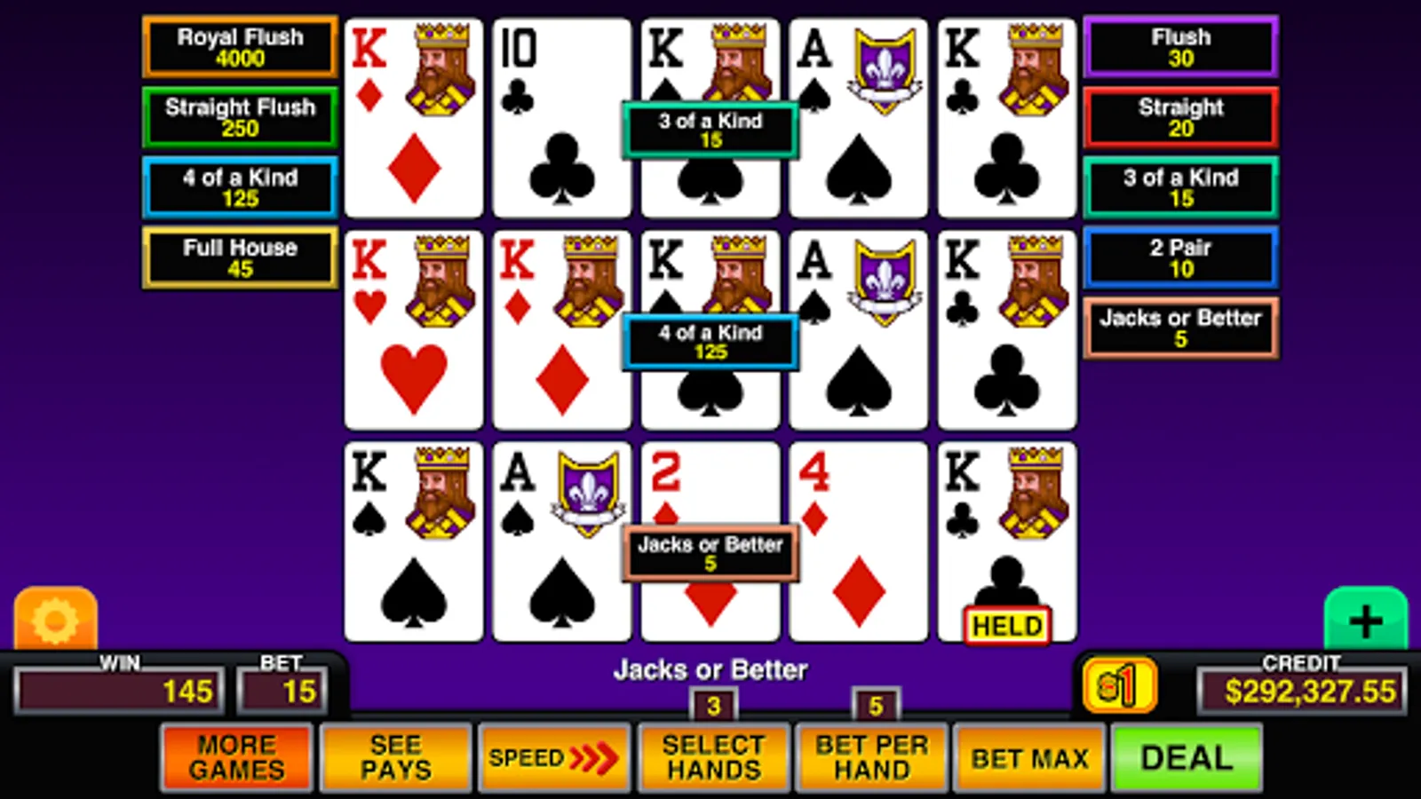 Video Poker Multi Pro features your favorite Three Hand, Five Hand, and Ten Hand video poker games.