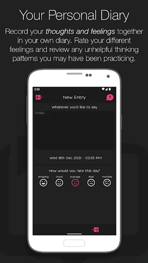 • A comprehensive diary to keep your thoughts and feelings together in, including the ability to rate feelings on a scale out of 10