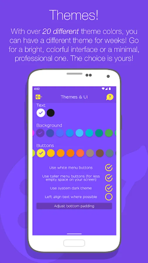 • Themes, including over 20 different colors to choose from in customizing the app