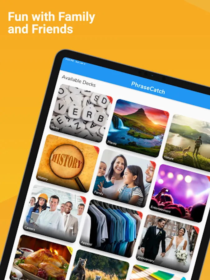 PhraseCatch is sure to brighten up your game night and get the whole family involved. Make game night more challenging and fun with this FREE app. PhraseCatch is a fun party card trivia game that you can play with your friends. It can be played in groups of 4, 6, 8… The more the merrier. The goal of the game PhraseCatch is to get your partners to guess the word you’re describing. Catchphrase the game is a combination of musical chairs, charades and hot potato!