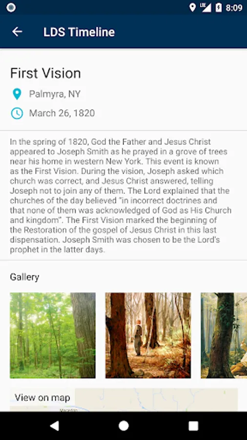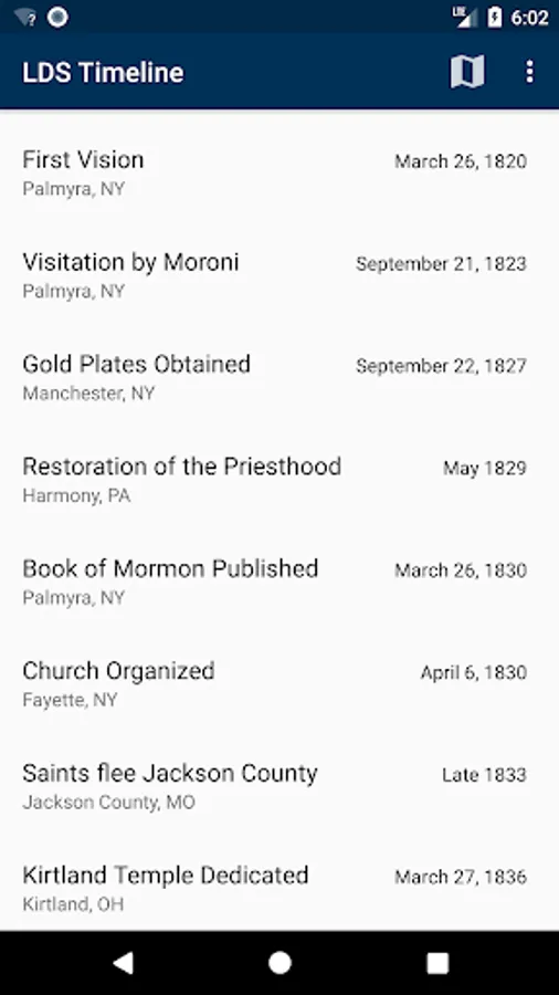 LDS Timeline was created for Prof. Sweat's Foundations of the Restoration class at BYU. This app provides information about key events in the early history of the Church of Jesus Christ of Latter Day Saints.