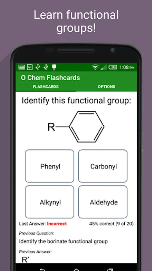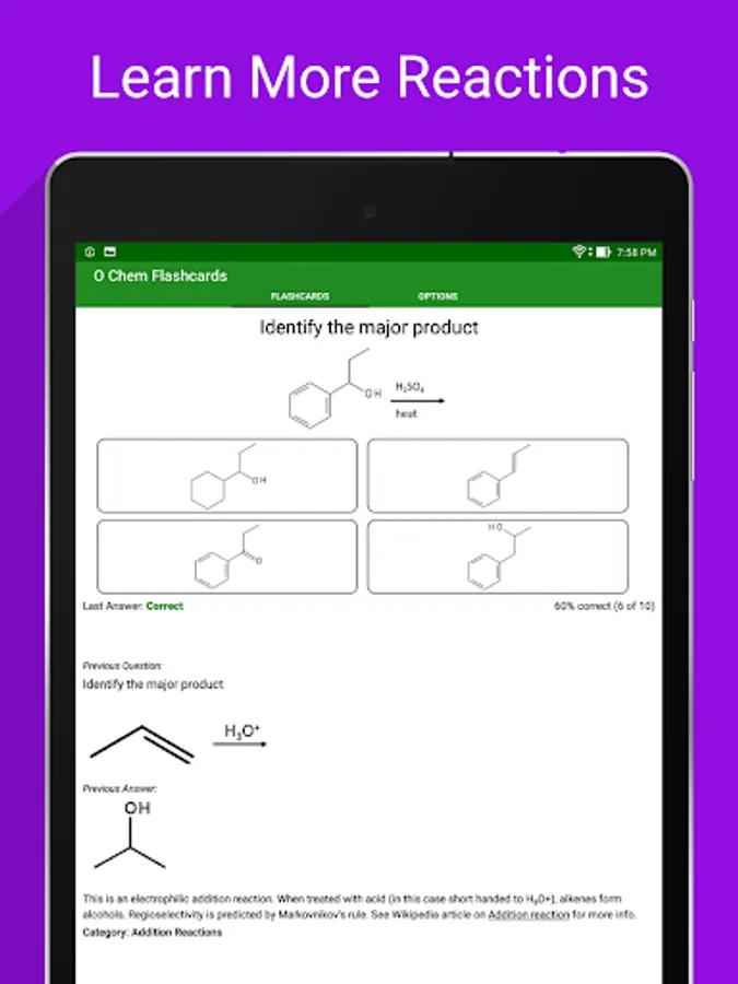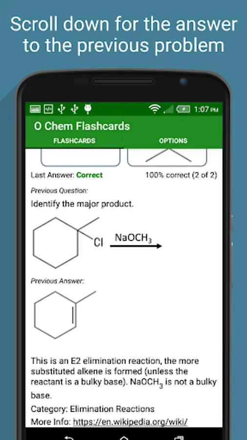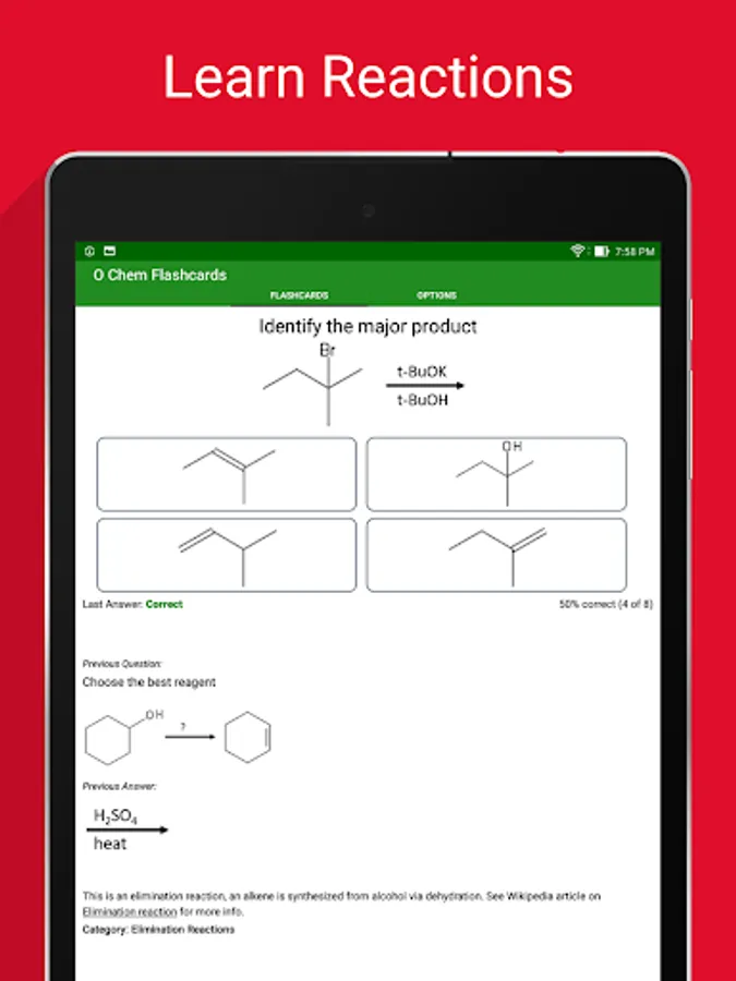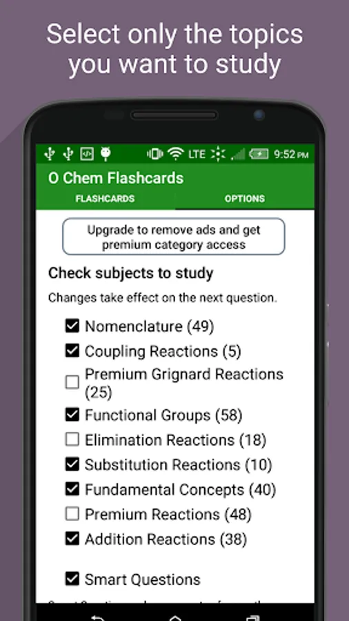 The subjects can be filtered out on the options tab (accessible by swiping right) so you only study the subjects you need to. For example, if you only want to study organic chemistry reactions, just select those categories. Your organic chemistry subject selections save across restarts so you are ready to go right when you open the app.