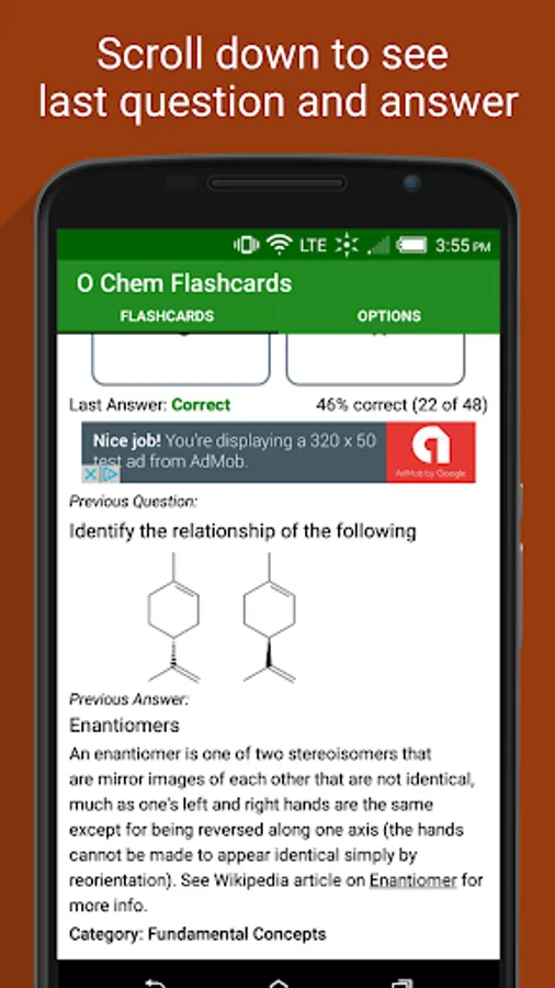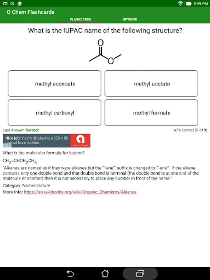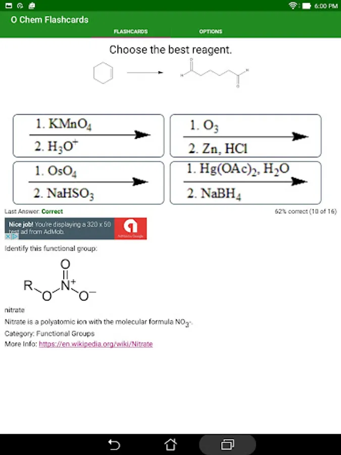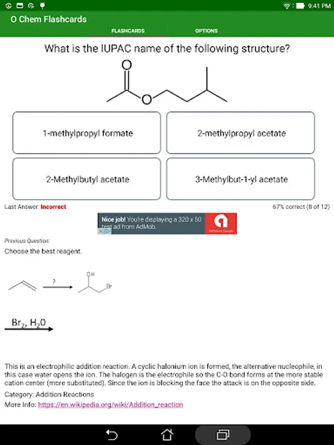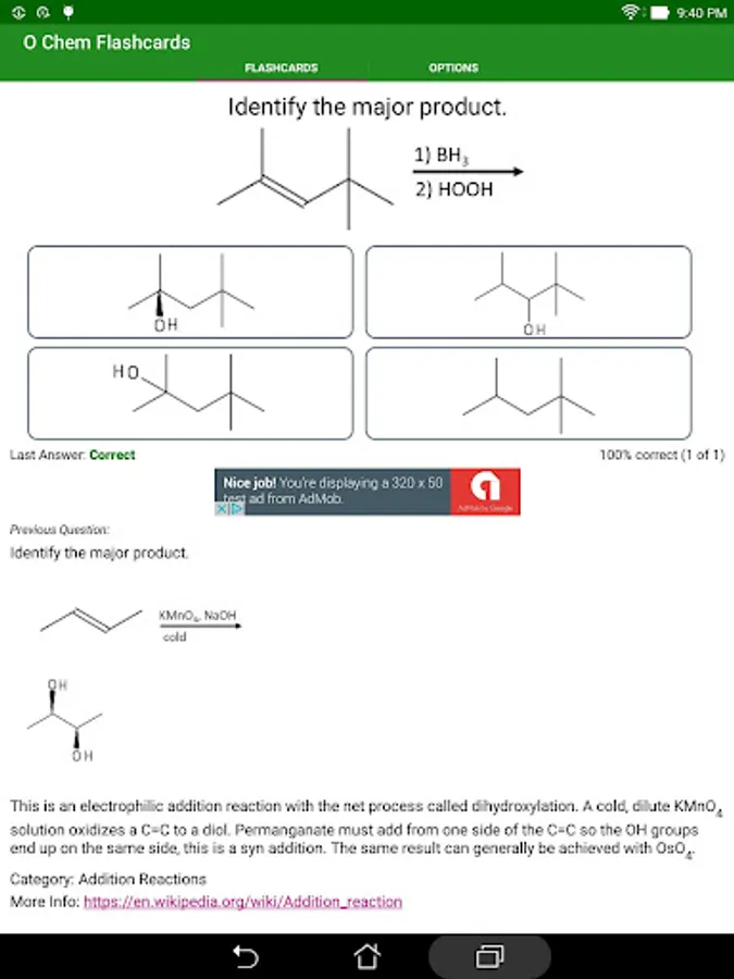An organic chemistry question is displayed with four multiple choice answers. When an answer is selected, the next question is displayed and you just scroll down to see the previous question, answer, and a brief explanation with a link to additional information.