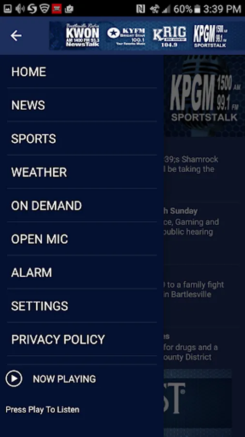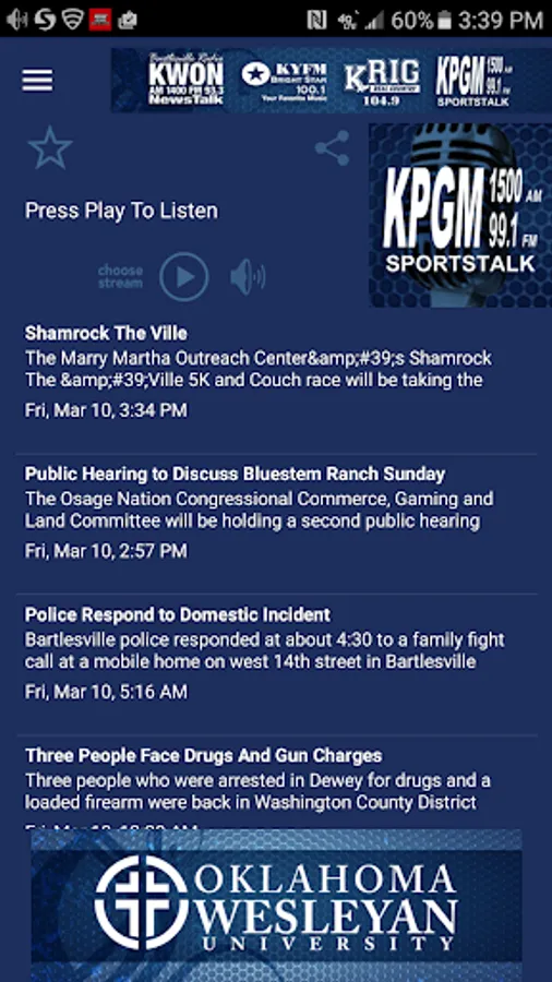 Listen to KWON 1400 AM, KYFM 100.1 FM, KRIG 104.9 FM and KPGM 1500 AM anywhere you go with our android app. Check Local news, sports and community events plus stay in contact with your favorite radio stations in NE Oklahoma and SE Kansas.