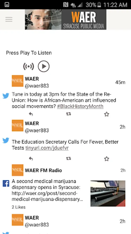 The WAER Public Media app allows you to access 3 streams of audio including news, jazz and alternative rock. View the radio schedule and access WAER.org digital news content. WAER is the public radio service of Syracuse University.