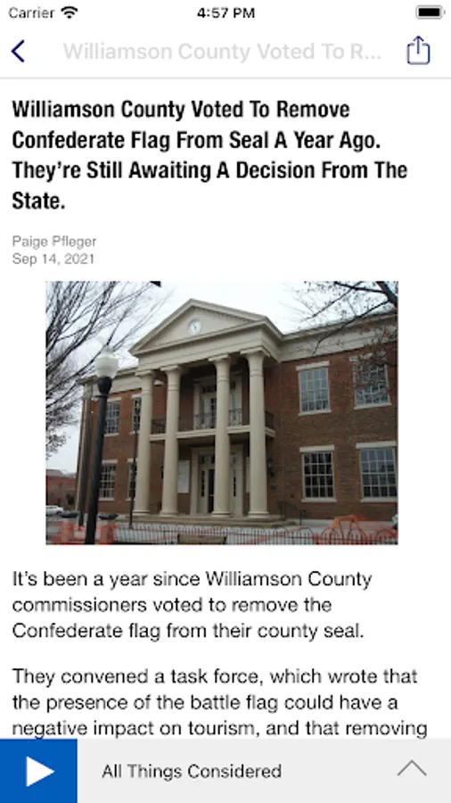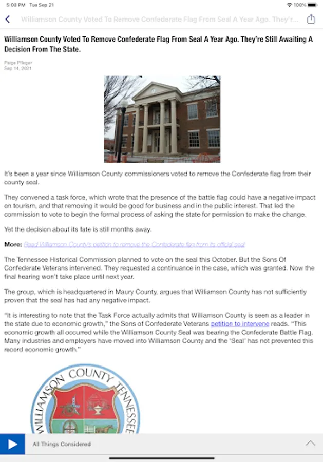 • The Nashville Public Radio App displays the web page associated with the program or program segment you are listening to On Demand so you can explore for more information.