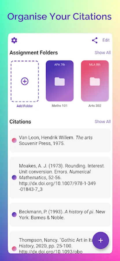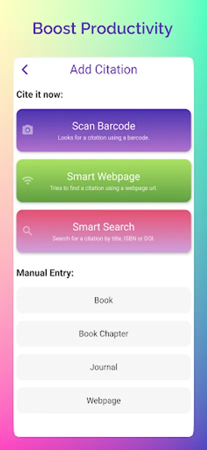 Automatically generate a webpage citation using a URL or cite a book by scanning its barcode.